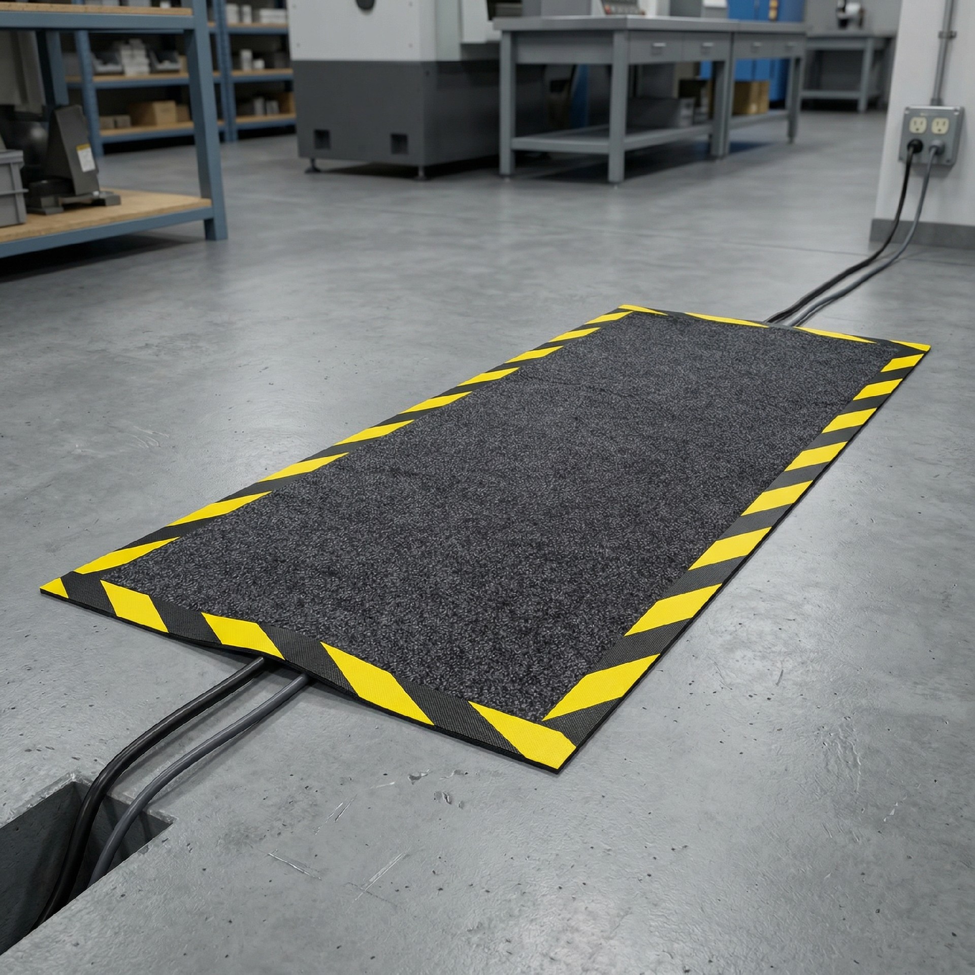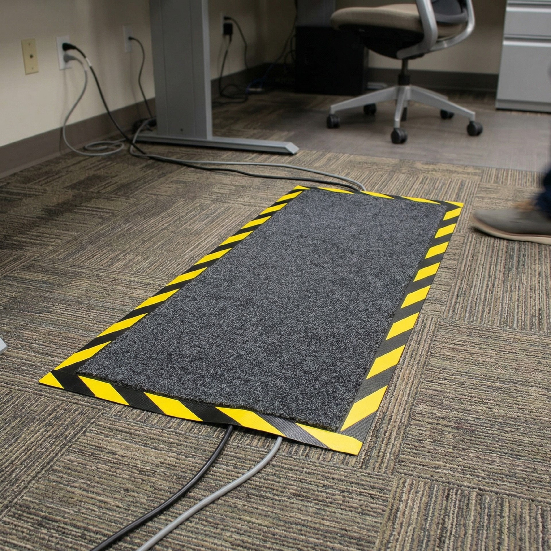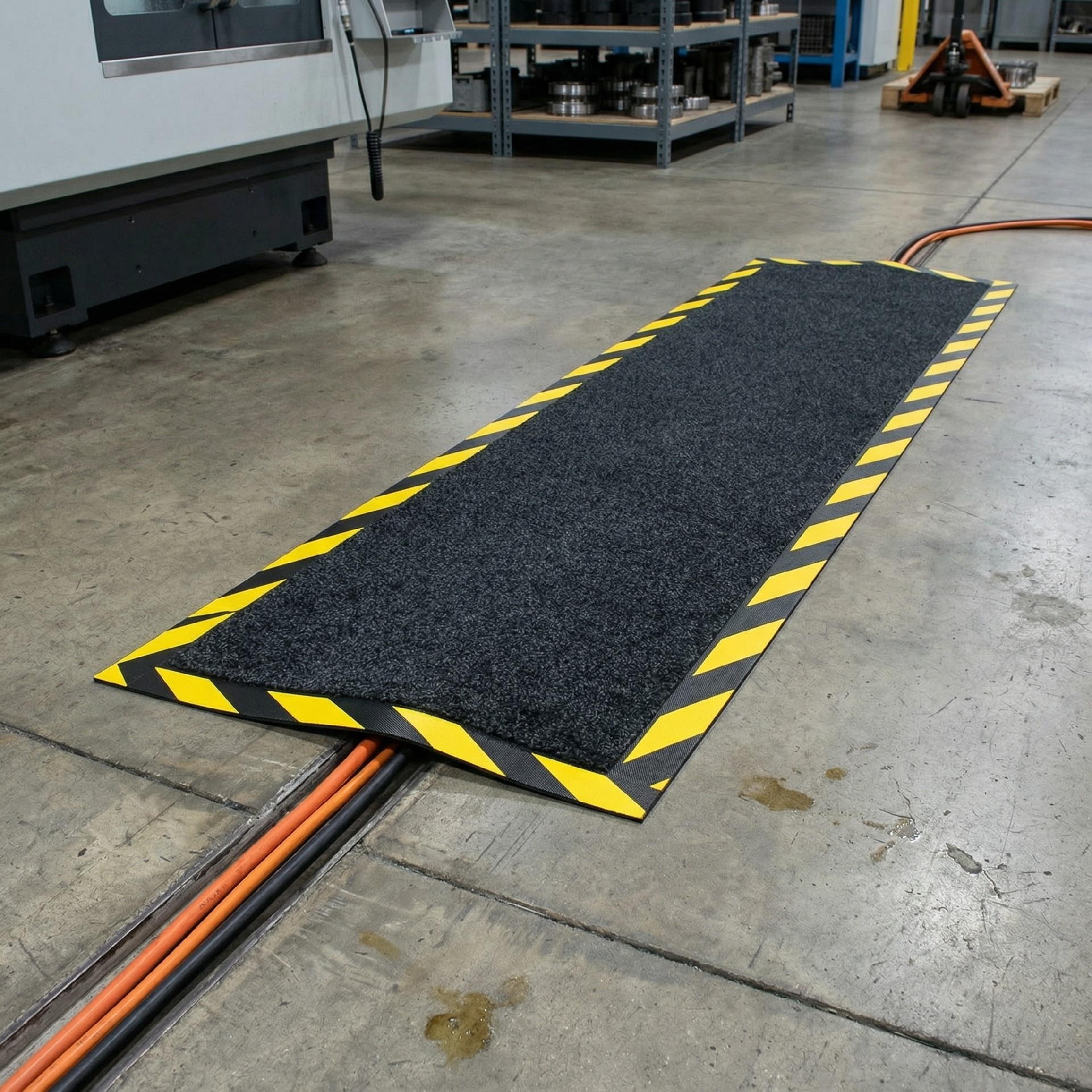 Helps reduce trip hazards in busy areas - Low-profile rubber cable protector mat with yellow safety border helps highlight cable runs and improve visibility in workplaces, entrances, walkways and utility areas.