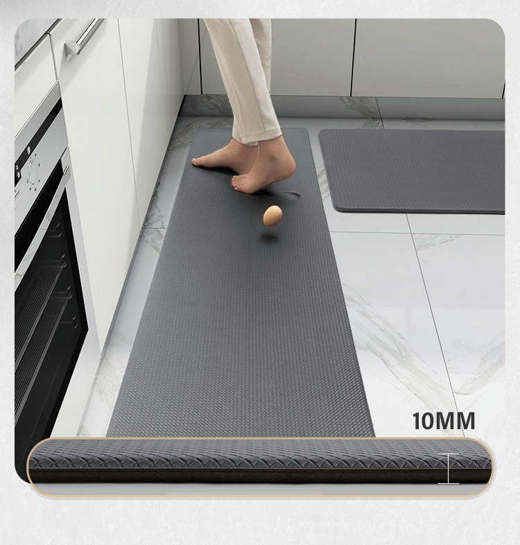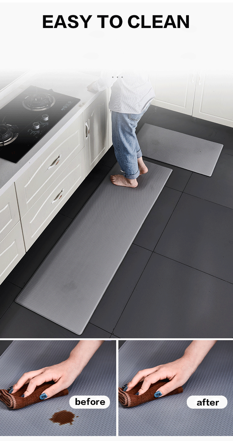 Kitchen mat is made of premium PU material to last for many years. The thick and comfortable PU material provides cushioned support to relieve leg and joint pain and pressure when standing or working for long periods of time